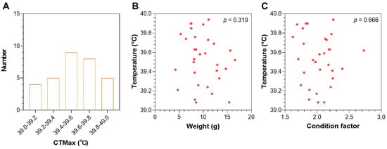 CTmax of the LMB juveniles. (A) Frequency distribution of CTmax (n = 31). (B) Correlation between CTmax and body weight. (C) Correlation between CTmax and condition factor.