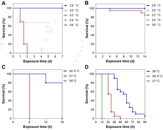 Survival curves of the LMB juveniles in the static heat exposure experiments. (A–D) Results of the first (A), second (B), third (C) and fourth (D) experiments. Fish number for each experimental group: (A) 10; (B) 20; (C) 10; (D) 20.
