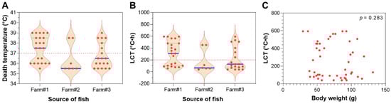 Death temperature and lethal cumulative temperature (LCT) of the LMB juveniles of different sources. (A) Death temperature of the fish (n = 23, 7 and 20). (B) LCT of the fish. The blue lines indicate medians. The red dashed lines indicate the bottleneck of the violin plots. (C) Correlation between the LCT and body weight.