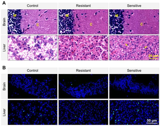 Sensitive and resistant individuals were identified from a new batch of LMB juveniles subjected to tiered heat exposure. Consistent with the behavioral observations, the H&E-stained liver sections of the heat-sensitive fish demonstrated a large numbers of vacuoles, indicating extensive tissue damage (Figure 4A). The liver sections of the heat-resistant fish had no obvious vacuoles but demonstrated deeper hematoxylin staining than those of the untreated controls (Figure 4A), suggesting catabolism of the nutrients deposited in the hepatocytes. However, no obvious changes were found for the brain (mesencephalon) sections of both the sensitive and resistant fish when compared with those of the controls (Figure 4A), indicating that the brain was less affected by the heat stress. Accordingly, while only minimal apoptotic cells could be seen in the mesencephalon sections, large numbers of apoptotic cells (Figure 4B) and a significantly higher ratio of apoptotic cells were found for the liver sections of the heat-sensitive fish (p < 0.05, Figure S4).
