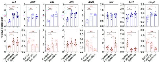 Expression of the endoplasmic reticulum (ER) stress response and apoptosis-associated genes determined by qPCR. The data for the brain and liver are shown in blue and red, respectively. The error bars indicate the standard deviation (SD), n = 6. *, p < 0.05; **, p < 0.01; ***, p < 0.001.