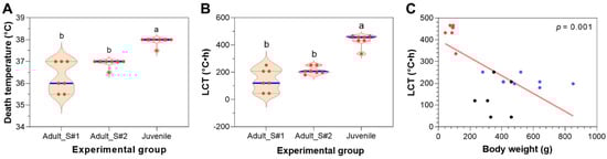 Comparison of the heat resistance of LMB adults and juveniles. (A) Death temperature of the fish (n = 7). (B) LCT of the fish (n = 7). The error bars indicate the standard deviation. Different letters above the error bars indicate a significant difference between the means (p < 0.05). (C) Correlation between the LCT and body weight of the fish. The black, blue and red dots indicate the individuals of adult_S#1, adult_S#2 and juvenile, respectively.