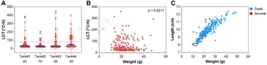 Selecting heat-resistant LMB juveniles with the tiered exposure method. (A) LCT of the experimental fish. The numbers of survivors are shown above the dots, the numbers of fish included in each replicate are shown below the tank number. The blue lines represent medians and the red dashed line separates heat-sensitive and resistant individuals. (B) Correlation between the LCT and body weight of the fish. (C) Correlation between the weight and length of the fish.