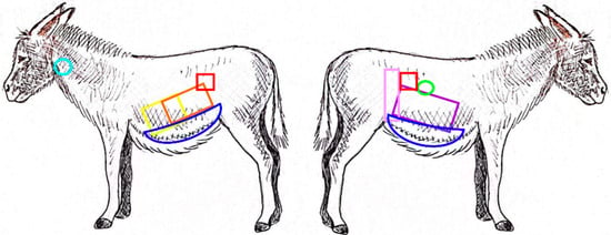 In conclusion, this study defined, for the first time, reference values for the probe position to be used for abdominal scanning in the field in healthy jennies. We also reported the wall thicknesses of the different gastrointestinal viscera in clinically healthy donkeys, which were found to only be partially related to the ones of the horse. In the present study, no pathological condition was investigated. In any case, it can provide a collection of basic data for further use for ultrasonographic scanning of a donkey’s abdomen as an important diagnostic tool to achieve an early diagnosis of pathological changes. Due to the low tendency of donkeys to show clinical symptoms of pain or discomfort compared to horses, ultrasound acquires considerable importance as an early diagnostic tool in the evaluation of this species.