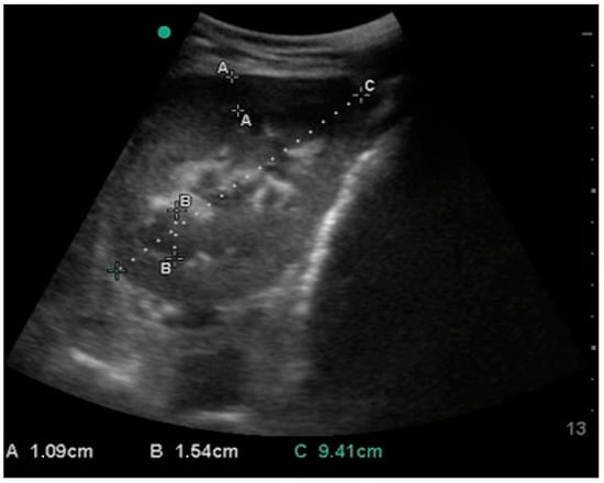Sonogram of the right kidney, obtained from the 17th ICS. Cortex (A), medulla (B) and length (C) measurements are reported. The green dot represents the marker of the probe; the left side of this image is dorsal, and the right side is ventral.