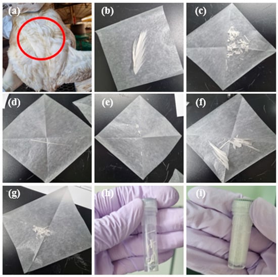 Photograph of feather samples showing the processing steps. (a) Feather sampling site (scapular region), (b) before mincing the whole feather, (c) after mincing the whole feather, (d) before mincing the rachis section, (e) after mincing the rachis section, (f) before mincing the vane section, (g) after mincing the vane section, (h) before pulverization, and (i) after pulverization.