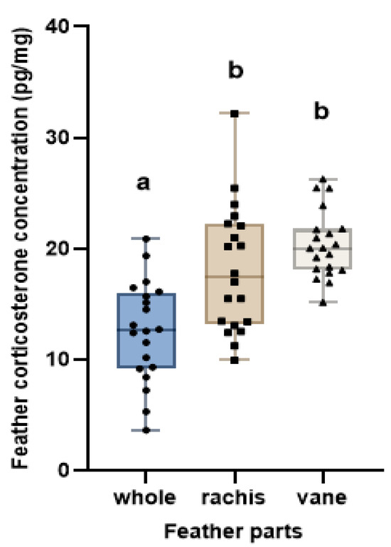 Corticosterone concentration (pg/mg) of the whole feather, rachis, and vane. Each point (circle, square, or triangle) represents an individual measurement of the respective feather parts. The horizontal line within each box indicates the median concentration. Boxes represent the interquartile range (IQR), and whiskers denote the data range, excluding outliers. a,b values above the box plot indicate a statistically significant difference (Tukey’s HSD test, p < 0.05).