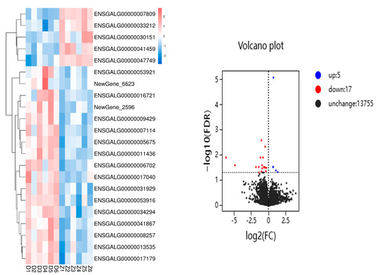 During the detection of differentially expressed genes, genes with a fold change (FC) ≥ 1 and a false discovery rate (FDR) < 0.05 were selected as the criteria. A total of 22 differentially expressed genes were screened between the 1 h group and the 0 h group in the chest skin tissue, including 5 upregulated genes and 17 downregulated genes.