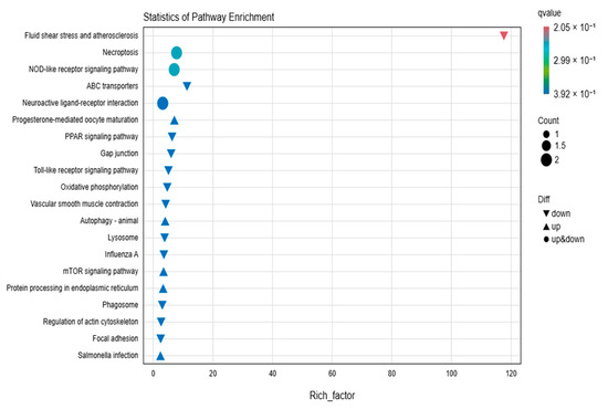 This figure presents the KEGG enrichment analysis of differentially expressed genes using a bubble plot. The bubble plot highlights the top 20 pathways with the smallest q-values. The size of the bubbles indicates the number of genes enriched in each pathway, and the color gradient reflects the q-value, with darker colors indicating lower q-values. Upregulated pathways are indicated by upward triangles, downregulated pathways by downward triangles, and pathways with both upregulated and downregulated genes by circles.