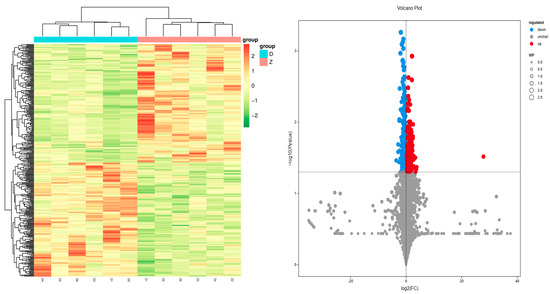 The clustering heat map and volcano plot of the differential metabolites are displayed in Figure 5. As shown in the figure, the expression patterns of metabolites among different samples exhibit a clear grouping trend, and there are significant differences in metabolites between the two groups.