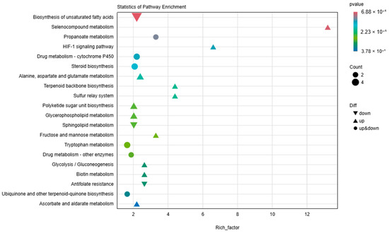 Pathway Enrichment Analysis of Differential Metabolites. This figure presents the KEGG enrichment analysis of differentially expressed metabolites using a bubble chart. The bubble chart highlights the top pathways with the smallest q-values. The size of the bubbles indicates the number of metabolites enriched in each pathway, and the color gradient reflects the q-value, with darker colors indicating lower q-values. Upregulated pathways are indicated by upward triangles, downregulated pathways by downward triangles, and pathways with both upregulated and downregulated metabolites by circles.