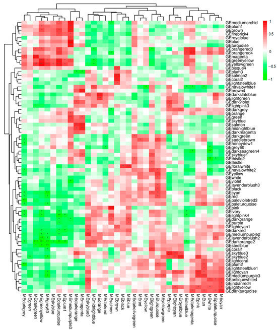 The correlation coefficient matrix heatmap (Figure 7) revealed significant correlations between differentially expressed genes and metabolites, with color gradients indicating the strength of inter-module correlations. Modules exhibiting p-values less than 0.05 were retained, highlighting strong associations between specific transcriptomic and metabolomic modules.