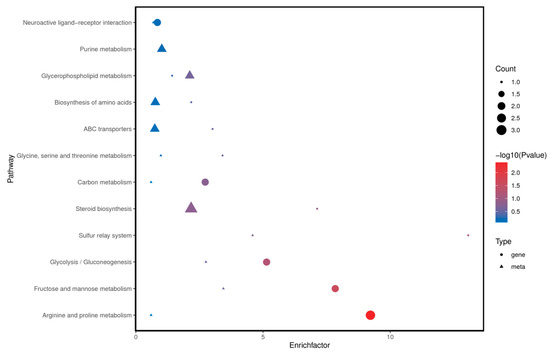 As shown in Figure 9 and Figure 10, we identified a total of 12 signaling pathways that were enriched with both differential genes and metabolites. These primarily include Arginine and proline metabolism, Fructose and mannose metabolism, Steroid biosynthesis, Glycerophospholipid metabolism, and Glycolysis/Gluconeogenesis.