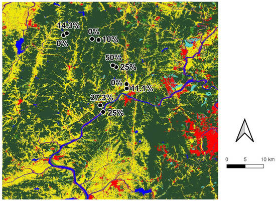 Sampling sites for Japanese tree frogs (D. japonicus) in paddy fields at 10 sites of Gongju-si. The Bd infection rate within each site is shown above each site.