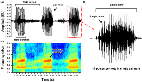 Oscillogram and sound spectrogram of advertisement calling from Japanese tree frogs. (a) oscillogram consisting of three call notes. Here we display the call note, note duration, and note period used to calculate call rate. (b) oscillogram consisting of single call note. Here we display a single pulse used to determine pulse per note. (c) Sound spectrogram composed of three call notes. Here we can see the dominant frequency of the advertisement calling.