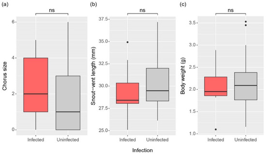Comparison of (a) Chorus size and (b) Snout-vent length, (c) Body weight between infected and uninfected male frogs. The significance of differences was determined by the Mann-Whitney U test and is indicated for no significance (ns, p > 0.05). The top line of the box represents the third quartile, the bottom line represents the first quartile, and the thick horizontal line in the middle represents the median. The vertical lines represent the 1.5 interquartile range, and dots represent outliers.