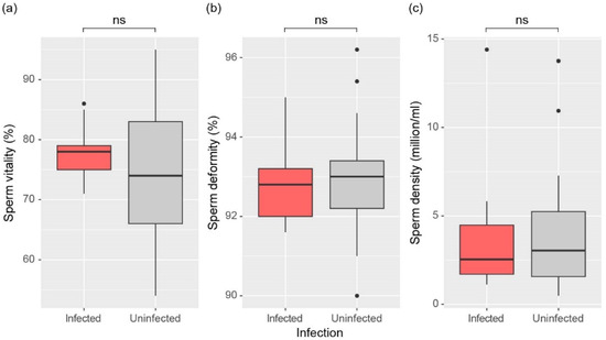 Comparison of (a) Sperm vitality, (b) Sperm deformity, and (c) Sperm density between infected and uninfected male frogs. The significance of differences was determined by the Mann-Whitney U test and is indicated for no significance (ns, p > 0.05). The top line of the box represents the third quartile, the bottom line represents the first quartile, and the thick line in the middle represents the median. The vertical lines represent the 1.5 interquartile range, and dots represent outliers.
