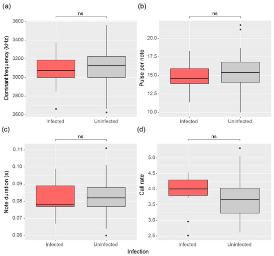Comparison of (a) Dominant frequency, (b) Pulse per note, (c) Note duration, and (d) Call rate between infected and uninfected male frogs. The significance of differences was determined by the Mann-Whitney U test and is indicated for no significance (ns, p > 0.05). The top line of the box represents the third quartile, the bottom line represents the first quartile, and the thick line in the middle represents the median. The vertical lines represent the 1.5 interquartile range, and dots represent outliers.