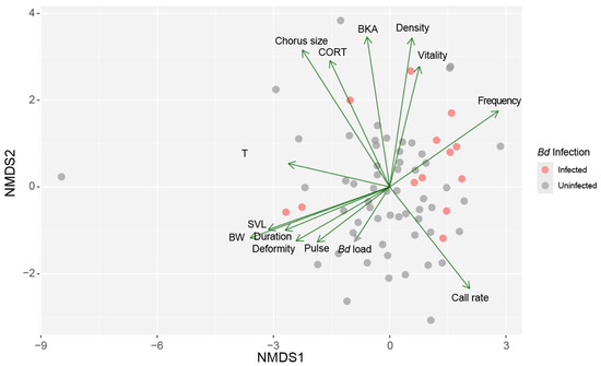 Non-metric multidimensional scaling (NMDS) ordination showing a high level of overlap between infected and uninfected frogs, but also subtle trends with some specific components: Bd infection load, chorus size, snout-vent length (SVL), body weight (BW), sperm vitality (vitality), sperm deformity (deformity), sperm density (density), bacterial killing ability (BKA), corticosterone (CORT), testosterone (T), dominant frequency (frequency), pulse per note (pulse), note duration (duration), call rate.