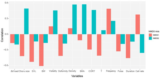 The variable correlation analysis also lends credence to these facts. On the NMDS1 axis, call rate (R = 0.46) and dominant frequency (R = 0.51) had positive loadings, whereas body weight (R = −0.61), SVL (R = −0.53) and sperm deformity (R = −0.42) had negative loadings (Figure 8). Meanwhile, in the NMDS2 axis, chorus size (R = 0.49), corticosterone (R = 0.46), BKA (R = 0.57), sperm vitality (R = 0.47), and sperm density (R = 0.57) showed a strong positive relationship, whereas call rate (R = −0.36) had negative relation (Figure 8).
