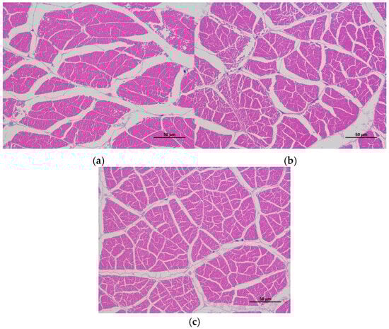 Muscle fiber structure of L. vannamei (H&E staining) fed with Hyp + VC and EU diets. (a), (b), and (c) represent the control, Hyp + VC, and EU groups, respectively.