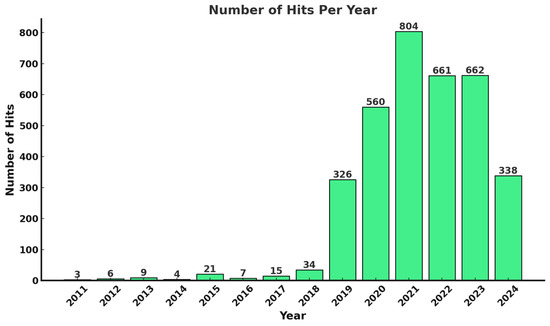 Figure 1 illustrates the decision-making process and outcomes for generating search results from a keyword-based prompt, specifically using the keyword “Animal Feed Formulation + Milk Yield”. Filters such as year range and specific journals were applied to reduce the volume of the results and refine the focus of the search. Figure 2 displays the number of hits per year based on the specified keywords. The filtered results were then evaluated for their relevance to the focus topic. If deemed satisfactory, the results were exported as a CSV file for further screening to determine which literature should be included. Filtered search results were only accepted if they aligned with the topic; otherwise, keywords were adjusted to reduce the results volume and generate more relevant outcomes. This iterative process was applied to multiple keywords, including combinations like “data-driven decision-making”, “feed formulation”, “milk quality”, “precision agriculture”, “decision support systems”, “milk yield”, “animal nutrition”, and “environmental conditions” to locate relevant studies.