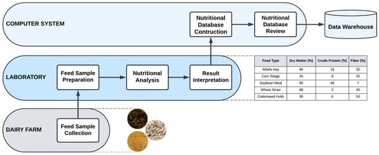 In the formulation of animal feed, particularly for dairy cows, the collection of relevant data are paramount for optimizing nutritional strategies that enhance milk production and overall herd health. Essential data sources include feed composition tables, which provide critical information on the nutrient content of various feed ingredients, such as energy, protein, fiber, vitamins, and minerals. Accurate feed composition data are crucial for formulating balanced diets that meet the specific nutritional requirements of dairy cows at distinct stages of lactation [49]. For instance, the nutritional value of feedstuffs can vary based on their source and processing methods, necessitating the use of updated and region-specific feed composition tables [50]. Figure 3 illustrates the process of creating nutritional databases for dairy cattle. The process begins with the collection of feed samples, which are then subjected to nutritional analysis to determine their composition. This analysis includes evaluating macronutrients (proteins, carbohydrates, fats), micronutrients (vitamins and minerals), and fiber content. Following this, the nutritional requirements of dairy animals are assessed based on their physiological status (e.g., lactating, dry, or growing) and production goals, which are critical for formulating balanced diets [51,52]. Once the nutritional content of the feed and the requirements of the animals are established, the next step involves formulating the diet. This can be achieved by using linear programming models that optimize the allocation of nutritional resources to meet the animals’ needs while considering feed availability and cost [52]. The formulated diets are then implemented on the farm, where animal performance and health monitoring are essential to meet nutritional goals. Adjustments to the diet may be necessary based on ongoing assessments of milk production, feed intake, and overall animal health [6,53].