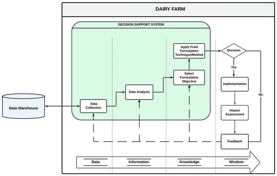 Applying knowledge in this manner signifies the effective use of data-driven insights in practical decision-making, termed wisdom for this framework. Decision support tools and systems are pivotal in facilitating this data-driven decision-making process. These tools encompass both software and hardware components that aid in data collection, processing, and analysis, thereby streamlining the decision-making workflow [55]. As illustrated in Figure 4, the evolution of data within the DSS progresses from initial collection to final decision-making, where formulation outcomes can either be accepted or rejected. Accepted formulations are implemented, and their impacts are assessed, while rejected formulations prompt feedback to the DSS for exploring alternative approaches [60]. This iterative feedback loop is essential for continuous improvement in feed formulation strategies. In conclusion, the framework for data-driven decision-making in feed formulations for dairy farms underscores the importance of a systematic approach that transitions from data collection to informed decision-making. By leveraging decision support systems and contextualizing data into actionable knowledge, dairy farmers can optimize their feed formulations, enhancing productivity and sustainability in dairy production.