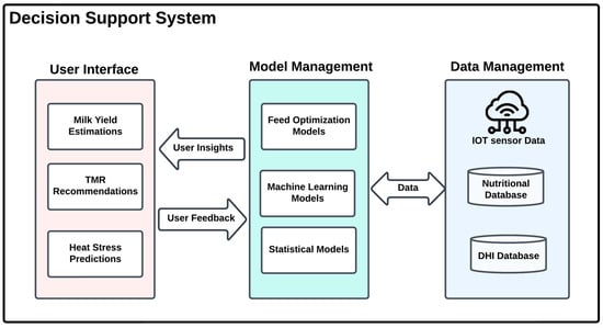 As illustrated in Figure 5, the system architecture is structured into three interconnected layers, each playing a critical role in supporting data-driven decision-making in dairy farming. The Data Management Layer forms the foundation, comprising IoT Sensor Data to monitor environmental conditions in real time, a Nutritional Database offering detailed feed nutritional content, and a Dairy Herd Improvement Database consolidating historical data on herd performance, health, and breeding to guide targeted interventions. Building on this, the Model Management Layer integrates Optimization Models for cost-efficient feed strategies, Machine Learning Models to predict outcomes such as milk yield and health trends, and Statistical Models for validating predictions and providing actionable insights. The User Interface Layer delivers these insights to end-users through three outputs: Milk Yield Estimation, TMR (Total Mixed Ration) Recommendations, and Heat Stress Prediction, enabling farmers to implement effective, timely interventions [81]. The emergence of Decision Support Systems (DSS) has been pivotal in addressing the complexities of modern dairy farming. DSS continuously integrates data from multiple sources, enabling farmers to make real-time decisions based on comprehensive insights [81]. Tools such as DairyMGT provide a suite of decision-support applications that assist farmers in improving economic performance and environmental stewardship through data-driven strategies [55,82]. These systems are particularly effective in managing herd health, as they analyze data related to nutrition, disease prevalence, and reproductive performance, ultimately leading to enhanced milk yield and quality [83,84].
