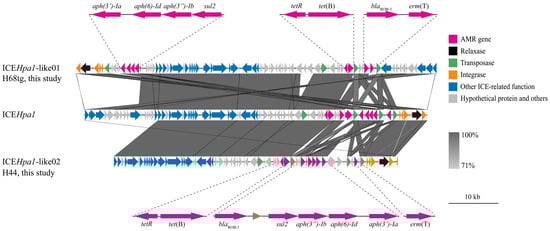 Putative ICEs identified in this study: ICEHpa1-like01 and ICEHpa1-like02. AMR gene, relaxase, transposase, integrase, ICE-related function sequences, and hypothetical proteins are indicated by colors according to the legend. Scale bar represents 10 kb pairs. AMR, antimicrobial resistance; ICEs, integrative and conjugative elements.