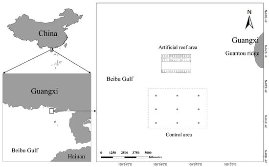 The marine ranch, named “Jinggong”, is located to the southwest of the Guantou Ridge in Beibu Gulf, with coordinates ranging from 21°25′31.26″ N to 21°25′58.96″ N and from 108°54′15.39″ E to 108°56′38.37″ E. The specific location of the marine ranch is illustrated in Figure 1. Covering an area of 4.80 km2, the marine ranch has an average water depth of approximately 9 m. According to the classification standards of the Ministry of Agriculture and Rural Affairs for national marine ranches, the Jinggong Marine Ranch is categorized as a “recreational” type. It was primarily established through artificial reef construction and hatchery releases. Moreover, an online environmental monitoring system was implemented to track the water quality. Since December 2020, approximately 20,000 cubic meters of artificial reefs were deployed, categorized into four types, as shown in Figure 2, with the materials predominantly being composed of reinforced concrete. The primary objective of the marine ranching project is to enhance the conservation and augmentation of fishery resources, thereby ensuring the sustainable development of fisheries. The target species for conservation and enhancement include fish such as Yellowfin Seabream (Acanthopagrus latus) and False kelpfish (Sebastiscus marmoratus), crustaceans like the Japanese Prawn (Marsupenaeus japonicus) and Japanese Stone Crab (Charybdis japonica), and Sea cucumber (Stichopus variegatus), as well as mollusks such as the Pacific Oyster (Crassostrea gigas) and Small Giant Clam (Lutraria sieboldii). Additionally, the project aims to stimulate the economy through recreational tourism activities, ultimately promoting the integrated development of both economic and social benefits. The control ecosystem is located about 2 km south of the marine ranch and has a water depth of about 9 m and a sandy silt bottom substrate. The selection of the control site was based on its ecological similarity to the marine ranching, particularly in terms of proximity to land and environmental characteristics. Both areas are located on the western side of Guantou Ridge and exhibit similar water quality conditions. While the ecological features of these areas are comparable, it is recognized that there are still some differences in factors such as flow fields and human activity impacts, particularly due to the ranching area’s closer proximity to the northern mainland.