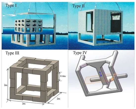 Types of artificial reefs deployed in marine ranching (sizes—type I: 3.0 m × 3.0 m × 3.5 m; type II: 3.0 m × 3.0 m × 3.5 m; type III: 2 m × 2 m × 2 m; type IV: 2.1 m × 2.1 m × 2.1 m).
