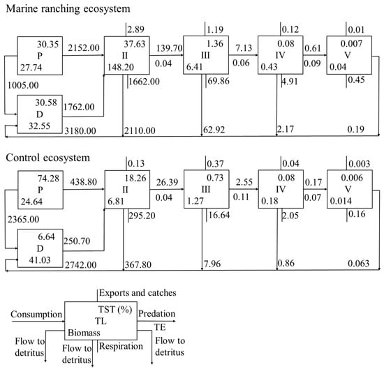 The energy flow among the TLs in the two ecosystems is depicted in Figure 3. Approximately 2152.00 and 2365.00 t/km2/a of energy flowed to TL II in the marine ranching and control ecosystems, respectively, accounting for 68.00% and 16.00% of their total primary production, respectively. The transfer efficiencies between TL II and III and III and IV were 4.00% and 6.00% in the marine ranching ecosystem, respectively, they were 4.00% and 11.00%, respectively. The average transfer efficiencies among TLs II to V were 5.84% and 6.47% in the marine ranching and control ecosystems, respectively.