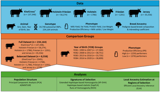 Therefore, the goal of this study was to identify the trend of haplotype selection signatures between high and low PR performance levels in the composite breed KiwiCross®. We also sought to compare the selection signature across generations of the composite breed KiwiCross®. We expected to observe different regions selected across birth year and performance levels and sought to map these regions or haplotypes back to the parental breeds to identify their breed origin. Identifying these ancestry-specific regions or haplotypes in composite crossbred cattle could aid dairy producers and researchers in efficiently optimizing breeding plans by increasing the accuracy of genomic selection to maximize the benefits of heterosis. Furthermore, various studies suggest that using haplotypes rather than single nucleotide polymorphism (SNP) genotypes usually leads to higher prediction accuracies. Our study aims to identify haplotypes associated with PR performance [25,26]. This may result from haplotype blocks having more SNPs in higher LD, including causative mutations, compared to an individual SNP, which may only explain a portion of the variation.