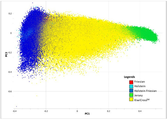 Genomic principal component analysis using 34,748 SNPs to compare the composite breed, KiwiCross® (n = 137,348) with their parental breeds, Holstein-Friesian (n = 58,274) and Jersey (n = 35,556). Purebred Holstein (n = 1786) and Friesian (n = 1201) populations were also included as the ancestry breeds for Holstein-Friesian in the analysis.