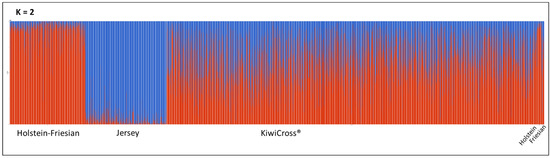 Admixture analysis reflecting optimal genetic clustering at K = 2 for the composite breed, KiwiCross® (n = 137,348), and parental populations of Jersey (n = 35,556) and Holstein-Friesian (n = 58,274). Local Holstein (n = 1786) and Friesian (n = 1201) were also included as ancestral breeds for Holstein-Friesian. However, due to having significantly fewer individuals representing both breeds, the breed composition was not distinctive. Individual vertical bars along the X-axis represent individual cattle grouped by breed; the Y-axis provides a measure of the population composition of each genetic breed found within individuals using 34,748 SNPs.