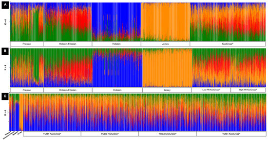 Admixture analysis reflecting genetic clustering of breeds using (A) the balanced number of composite breeds, KiwiCross® (n = 2678); (B) low-performance KiwiCross® (n = 1376) and high-performance KiwiCross® (n = 1259; and (C) different YOB groups (YOB1, n = 27,369; YOB2, n = 38,751; YOB3, n = 33,735; and YOB4, n = 38,899). All three admixtures were run using a balanced parental population of Jersey (n = 1778), Holstein-Friesian (n = 1748), Friesian (n = 1201), and Holstein (n = 1786), for K = 4. Individual vertical bars along the X-axis represent individual cattle grouped by breed; the Y-axis provides a measure of the population composition of each genetic breed found within individuals using 34,748 SNPs.