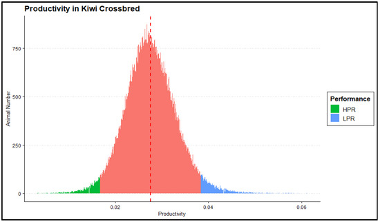 Distribution of productivity performance (PR) measurements and identification of extreme performance levels within tails of the distribution. Colored by different performance categories, (blue—low-performance (LPR), n = 1376; green—high-performance (HPR), n = 1259; red—average performance, n = 134,713). The dotted vertical red line denoted the mean measurement of the trait (mean: 0.028 ± 5.43 × 10−6).