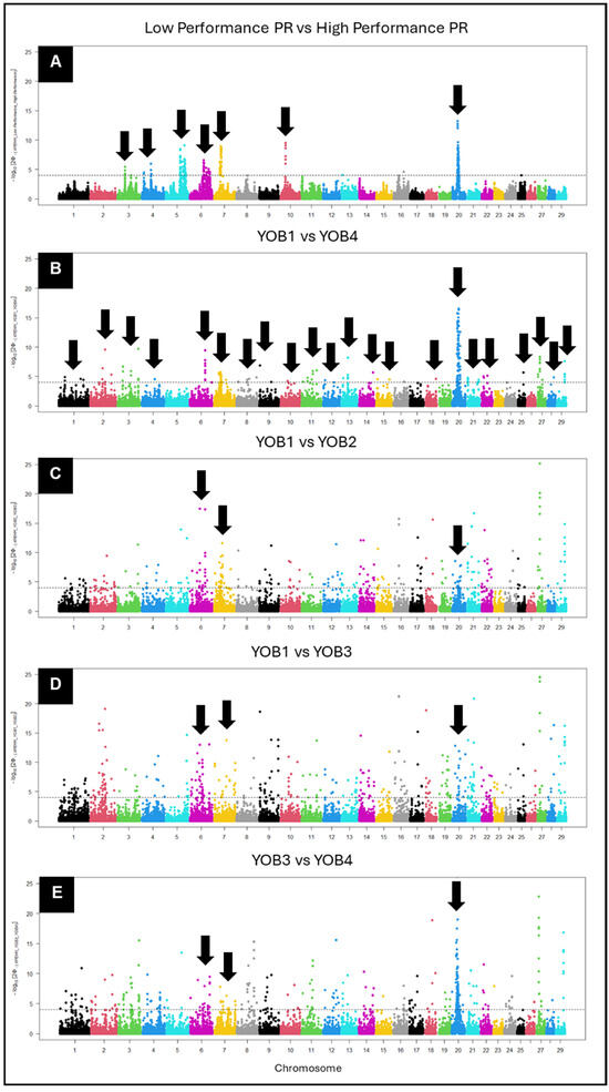 Manhattan plot of a cross-population extended haplotype homozygosity (XP-EHH) score for pairwise comparisons between (A) low-performance vs. high-Performance, (B) YOB1 vs. YOB4, (C) YOB1 vs. YOB2, (D) YOB2 vs. YOB3, and (E) YOB3 vs. YOB4. The significance threshold depicted by the horizontal line was set at 4 as suggested by the rehh package manual. The downward arrows identify genomic regions where there was significant population differentiation (p-value < 0.5). The dots within the plot represent single-nucleotide polymorphisms (SNPs) respective of their genomic location. The color of the dot (SNP) represents the chromosome it is located on with each color change reflecting a change in chromosome.