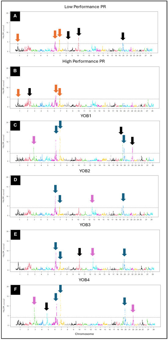Manhattan plot of hapFLK score for (A) low-performance PR (n = 1376); (B) high-performance PR (n = 1259); (C) YOB1 (n = 27,369); (D) YOB2 (n = 38,751); (E) YOB3 (n = 33,735); and (F) YOB4 (n = 38,899). Each group was analyzed against all four parental sources with Ayrshire as an outgroup. The significance threshold depicted by the horizontal line was set at 4 for uniform purposes with the XP-EHH method. The downward arrows denote regions either common across categories (high- and low-performance = orange; across all YOB groups = blue; and across at least two YOB groups = light blue) or unique within a specific category (black). The dots within the plot represent single-nucleotide polymorphisms (SNPs) respective of their genomic location. The color of the dot (SNP) represents the chromosome it is located on with each color change reflecting a change in chromosome.