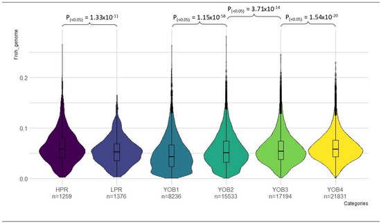 Significant differences (p < 0.05) in inbreeding-based ROH (FROH) were found when comparing between high–low performance levels and between YOB groups. Varying colors distinguish the different groups: HPR—purple, LPR—violet, YOB1—teal, YOB2—green, YOB3—light green, YOB4—yellow.