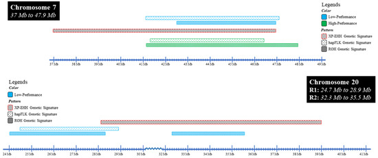 Location of overlapping regions (BTA 7 and BTA 20) detected in XP-EHH, HapFLK, and ROH between high–low productivity performance levels. The region on BTA 7 was found in both high- and low-PR animals whereas two regions were identified in only the low-performance group on BTA 20. Colors and shading of horizontal bars show where specific analyses identified a signal of selection.