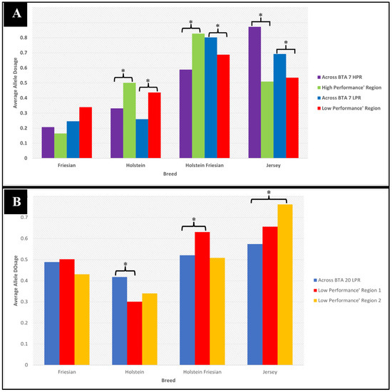 Comparison of the average allele dosage of ancestry breeds within KiwiCross® on (A) BTA 7 (targeted region: 37 Mb to 47.9 Mb) and (B) BTA 20 (targeted region 1: 24.7 Mb to 28.3 Mb, region 2: 33 Mb to 35.5 Mb). * denotes a significant difference with p-value < 0.05.
