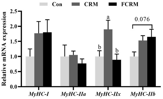 MyHC-IIb expression also displayed an upregulating trend when pigs were supplemented with FCRM relative to that in the CON group. Previous studies indicated that muscle fibers are not static structures that can adapt quickly to environmental changes, such as alterations in nutritional input [