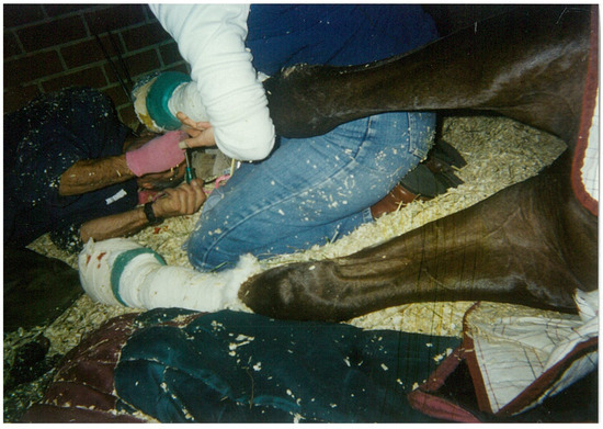 Eventually, Cambridge woke up but did not attempt to stand. As it was very late, I gambled on a dressing change with Cambridge recumbent, which if he acquiesced, would eradicate the discomfort of standing on a compromised hoof. I knelt next to him, slipping on his bit and his training bonnet—I worked him in a half-cup racing bonnet—and then sat with him to gauge his response. Cambridge lay there, unperturbed. Allison replaced me at his head and, incredibly, Cambridge rolled onto his side. I interpreted this—as I had done during Cambridge’s training days when he did something unexpected—as him encouraging me to follow his lead. In a moment of intersubjectivity, horse and humans were reflecting what Elizabeth Behnke terms ‘grounding’, which ‘alters the ‘motor intentionality’ of the situation, for letting weight settle interrupts the bodily “being on the brink of” reacting in a particular way’ [60] (p. 103). When I finished, Cambridge sat up. I quickly cleared the box making room for him and he rose to his feet. From that night forward, I changed Cambridge’s dressings with him recumbent. The unconventionality of this arrangement cannot be overstated: Cambridge was not a powerless victim; he was an empowered participant in his recovery.