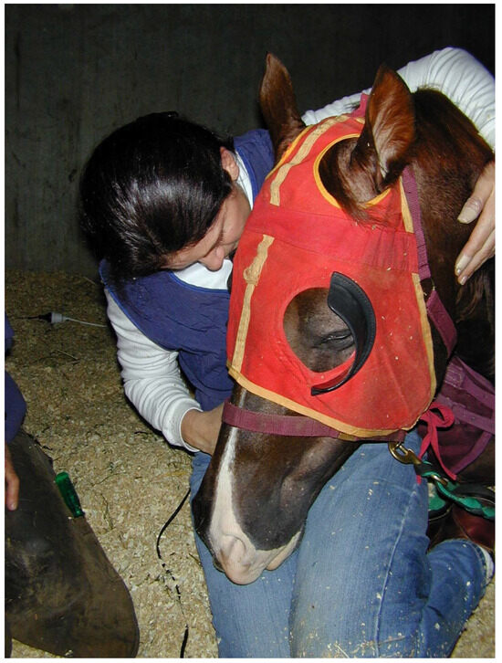 The practical and moral challenges of end-of-life decision making regarding horses belong to a different research paper; but the public exposure generated by media representations concerning Cambridge, were not anchored in a recognition of human limitations and did not accord the animal subject any agency in whether he should live or die. Rather, Cambridge became an object of wild speculation mediated by gendered, racialised, and classed discourses that were based on a reinscription of the human/animal divide, which feminists have long argued is structurally interrelated with other hierarchical dualisms (man versus woman, reason versus emotion, mind versus body, West versus non-West, and so on). In contrast, the autoethnographic narrative provided here aims to accentuate the need to attend to situated knowledges, among scientific and tacit knowledges, in order to ‘become with’ a horse in a relationship based on humility, curiosity, mutual vulnerability and trust. These different types of knowledges are central to forging a more nuanced ethics of animal welfare organised politically on behalf of animals and motivated by an intersectional ethics of care and responsibility. And whilst it is acknowledged that instrumental valuing—the use of an animal as a means toward an end that is defined as valuable by humans [56] (p. 142)—allows for, amongst other things, veterinary clinical practice, Cambridge’s demonstrations of feral resistance in his early days, and his insight into instinctual behaviour which enabled him to adapt to his personal circumstances during treatment, implores a more intrinsically based value system which recognises and enables a greater agency when humans engage with horses intersubjectively. Within the feminist care tradition in animal ethics this attention and acknowledgment of feeling and relationality should be considered alongside rights-based reliance on reason and abstract judgment and as such, becomes a “relational culture of caring and attentive love” [69] (p. 375): in other words, a radically different kind of ethics (Figure 3).