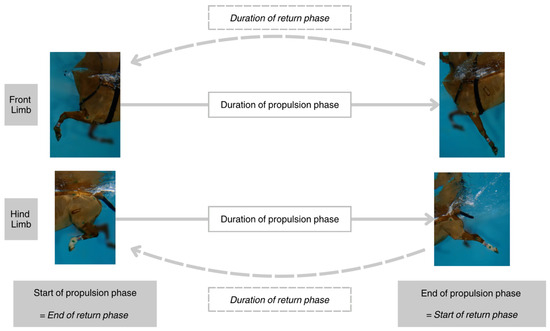 22]. The main difference during swimming lies in the absence of ground contact, which alters the analogy of stride phases. The propulsion phase in the pool cannot be restricted to the same definition as the propulsion phase in terrestrial locomotion, as propulsion occurs earlier in the water due to the absence of a shock absorption phase. The equivalent of the terrestrial swing phase is termed “return”, during which the limb moves forward again. Additionally, an extra phase exists in the pool, which can be considered as a “sliding phase”, occurring between the propulsion and return phases. This phase corresponds to a period where the stationary limb benefits from the inertia of movement in water. In summary, during swimming, the propulsion phase encompasses the movement of a limb from the start of its backward motion until it stops at the end of that backward motion, corresponding to the retraction movement. The return phase, on the other hand, encompasses the limb’s movement from the beginning of its forward motion until it stops at the end of that motion, corresponding to the protraction movement [
