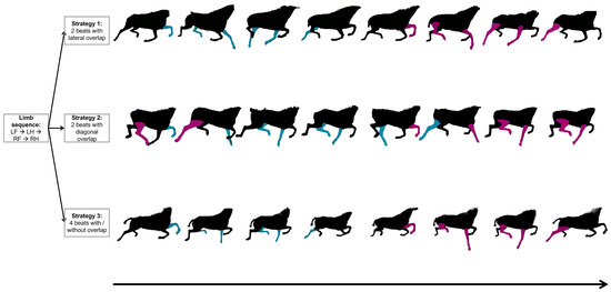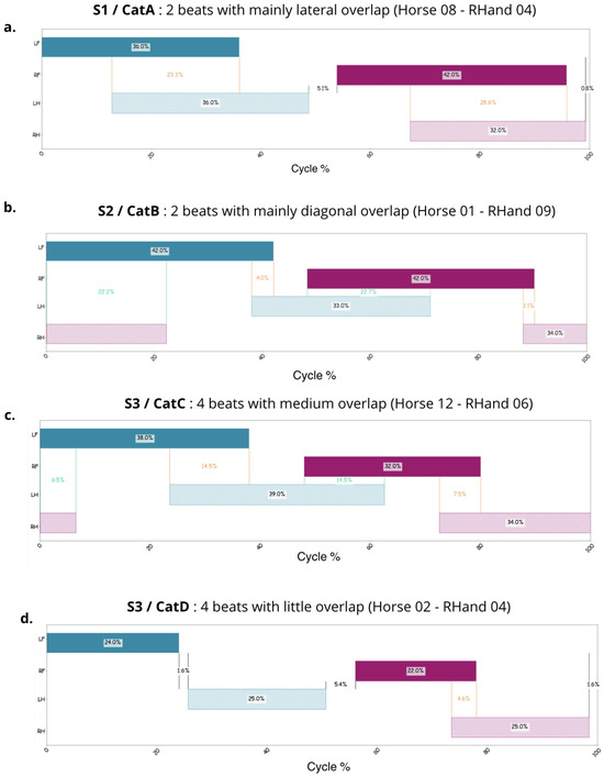 All horses in our studied population follow the same limb propulsion sequence: if starting with the left front limb, the next propulsive limb is the left hindlimb, then the right front limb, and finally the right hindlimb. However, this study demonstrates that the timing of these movements differs, with varying degrees of overlaps between these limbs. The veterinarians identified three temporal coordination patterns: strategy S1 as a lateral two-beat strategy characterized by the pairing of limbs in lateral fore–hind pairs, strategy S2 as a diagonal two-beat strategy characterized by the pairing of limbs in diagonal fore–hind pairs, and strategy S3 as a four-beat strategy characterized by the desynchronization of each limb. Qualitatively, for the two-beat strategies (strategies S1 and S2), it was hypothesized that the delay (lateral or diagonal) should be small with respect to duty factors (front or hind), meaning that the pairs of limbs (lateral or diagonal) will be synchronized, resulting in large overlaps (lateral or diagonal). In strategy S3, the four beats are regular and decomposed, so the delay should be large with respect to the duty factors, resulting in relatively small overlaps. By using indices (