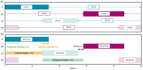 23]. By applying these methods to swimming, we can meticulously describe limb movements in water, compare aquatic and terrestrial coordination patterns, and identify adaptations specific to the aquatic environment. In the pool, the bar corresponding to the terrestrial stance phase will be replaced by the propulsion phase. Using these coordination graphs, various indicators can be calculated for a quantitative analysis of gaits in terrestrial biomechanics, such as the duty factor (the ratio of the stance phase to the stride duration), overlap (the period during which two or more specified limbs are simultaneously in stance), and advance placement (the time interval between the ground contact of two specified limbs) [