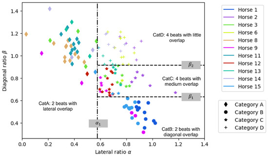 confirms and refines the visual classification established by the veterinarians. This approach enables the computation of thresholds, allowing each horse’s laps to be classified into one of the three strategies. For the four-beat strategy, two subcategories were identified: one with a low overlap percentage and another with a medium overlap percentage. During the 12 laps performed by each horse, 5 horses maintained the same strategy, while 6 others changed their strategy over time, demonstrating inter-individual variability. The latter used two or three different swimming patterns, demonstrating intra-individual variability. Based on their observations, Grossi et al. [